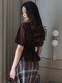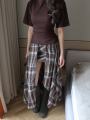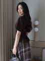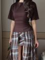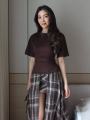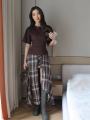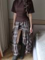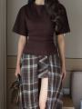 Футболка на завязке и двойная юбка в клетку.