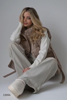Утеплнный жилет бежевого цвета прямого силуэта По бокам расположены накладные карманы практичное рещение для хранения мелочей или согрева рук Пояс идет в комплекте.
