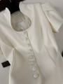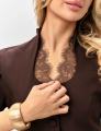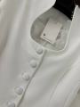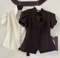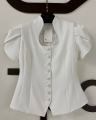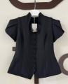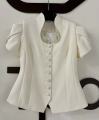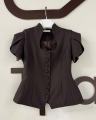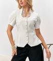 Приталенный женский жакет сибаской и коротким рукавом фонарик с вырезом на груди с гипюровыми вставками подчркивает фигуру придавая образу собранность и уверенность.