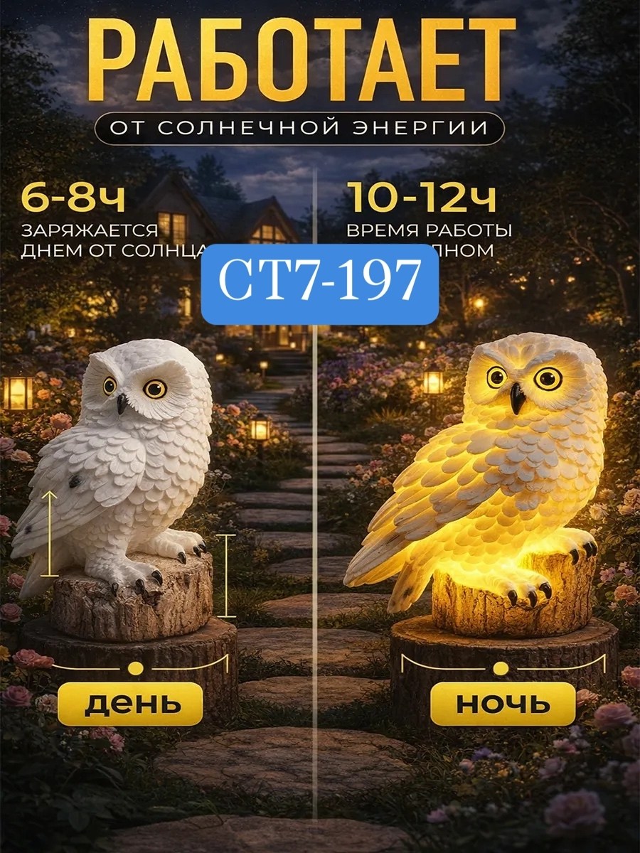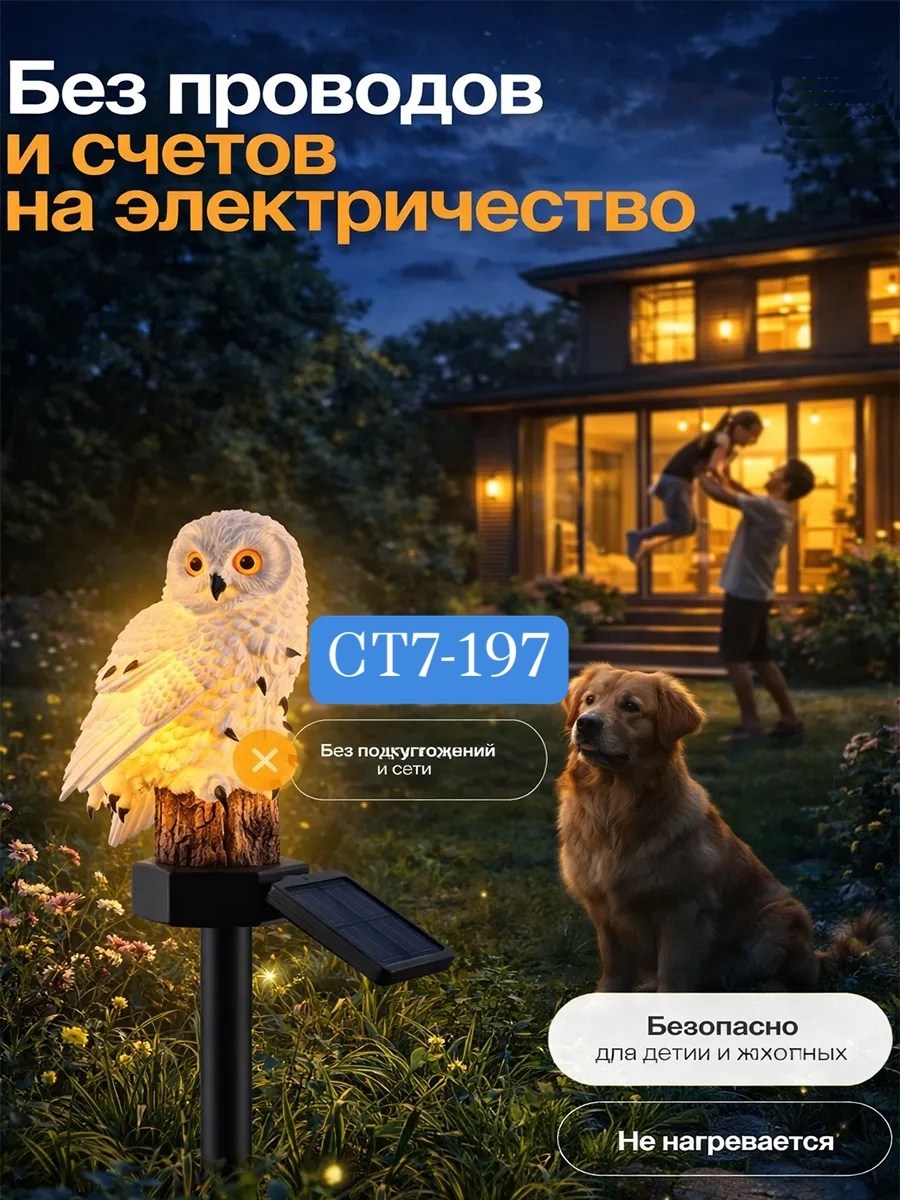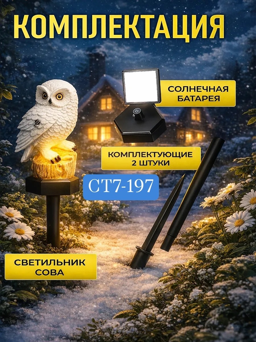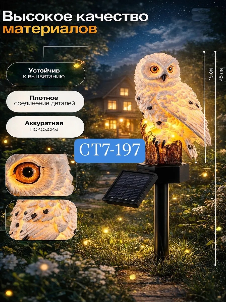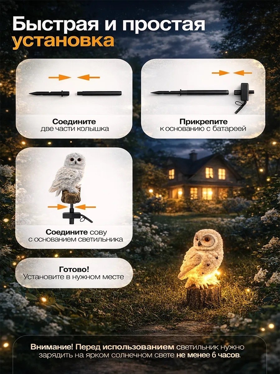 Комплектация: светильник статуэтка в форме совы, солнечная панель, подставка под светильник.