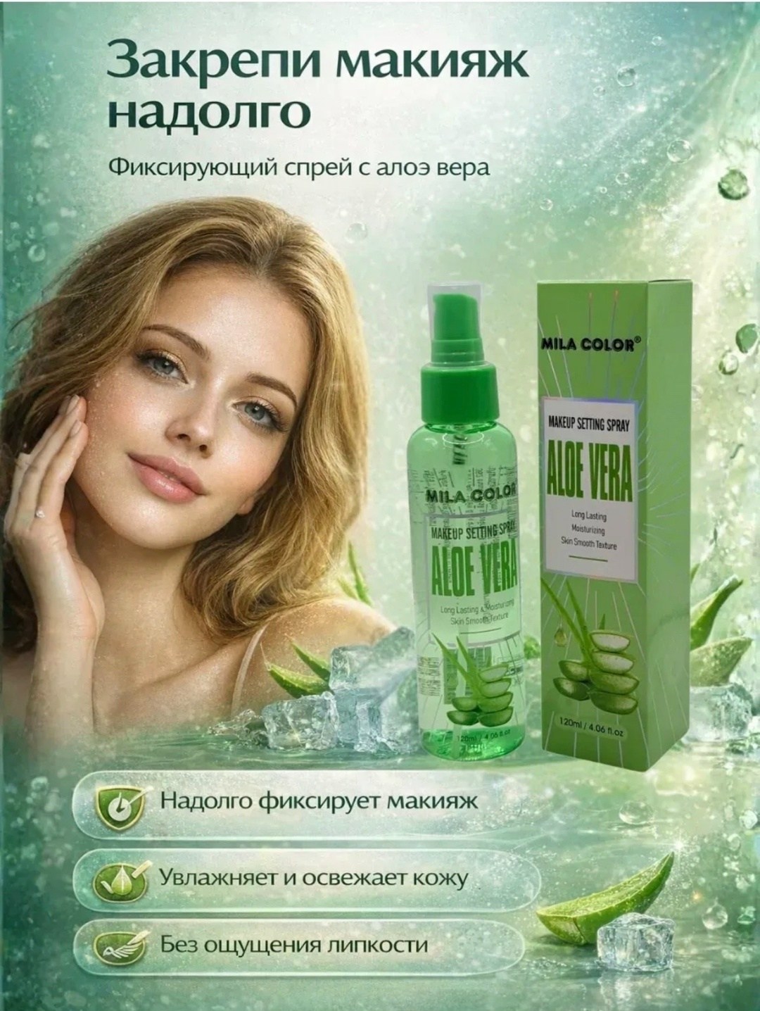 Фиксатор для макияжа с алоэ вера обладает увлажняющим действием и способствует более комфортным ощущениям на коже Формула помогает визуально выровнять текстуру лица, сделать макияж более аккуратным и естественным, без эффекта стянутости и липкости.