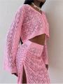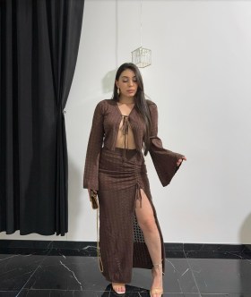 Нежный вязаный костюм: кроп-кардиган и юбка макси с разрезом - идеальное сочетание комфорта и стиля.