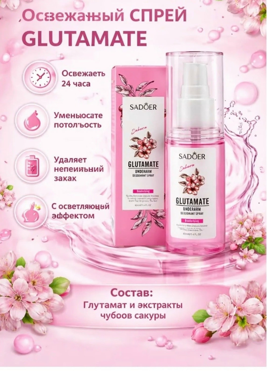Цена 120 рублей дезодорант-спрей для подмышек с ароматом сакуры предназначен для ежедневного ухода и ощущения свежести в течение дня Лгкая неаэрозольная формула комфортно наносится, быстро высыхает и не оставляет липкости на коже Нежный цветочный аромат создат ощущение чистоты и ухоженности Подходит для регулярного использования.