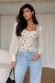 С нежным цветочным принтом на корсете Облегает и подчеркивает талию, плечи.