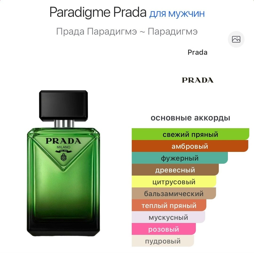 Аромат prada paradigme изысканный, но смелый, сдержанный, но выразительный мужской древесно-цитрусовый аромат, выпущенный в 2025 году модным домом prada Аромат переосмысливает уверенность в себе как любопытство, силу как изящество, а успех как свободу создавать собственную парадигму Парфюм предлагает неожиданную структуру: перевернутую пирамиду Он открывается с ярким, дымным сочетанием перуанского бальзама, бензойной смолы и гваякового дерева, а завершается искрящейся свежестью цитрусовых нот, хотя в классической парфюмерии цитрусовым нотам отводится начало композиции, а древесным ее финал.
