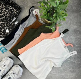 Майка женская, укороченная Самая популярная модель в гардеробе каждой девушки Топ выполнен из высококачественного хлопка кашкорсе, мелкий рубчик, круглая горловина, оригинальные бретели обработаны широкой бейкой.