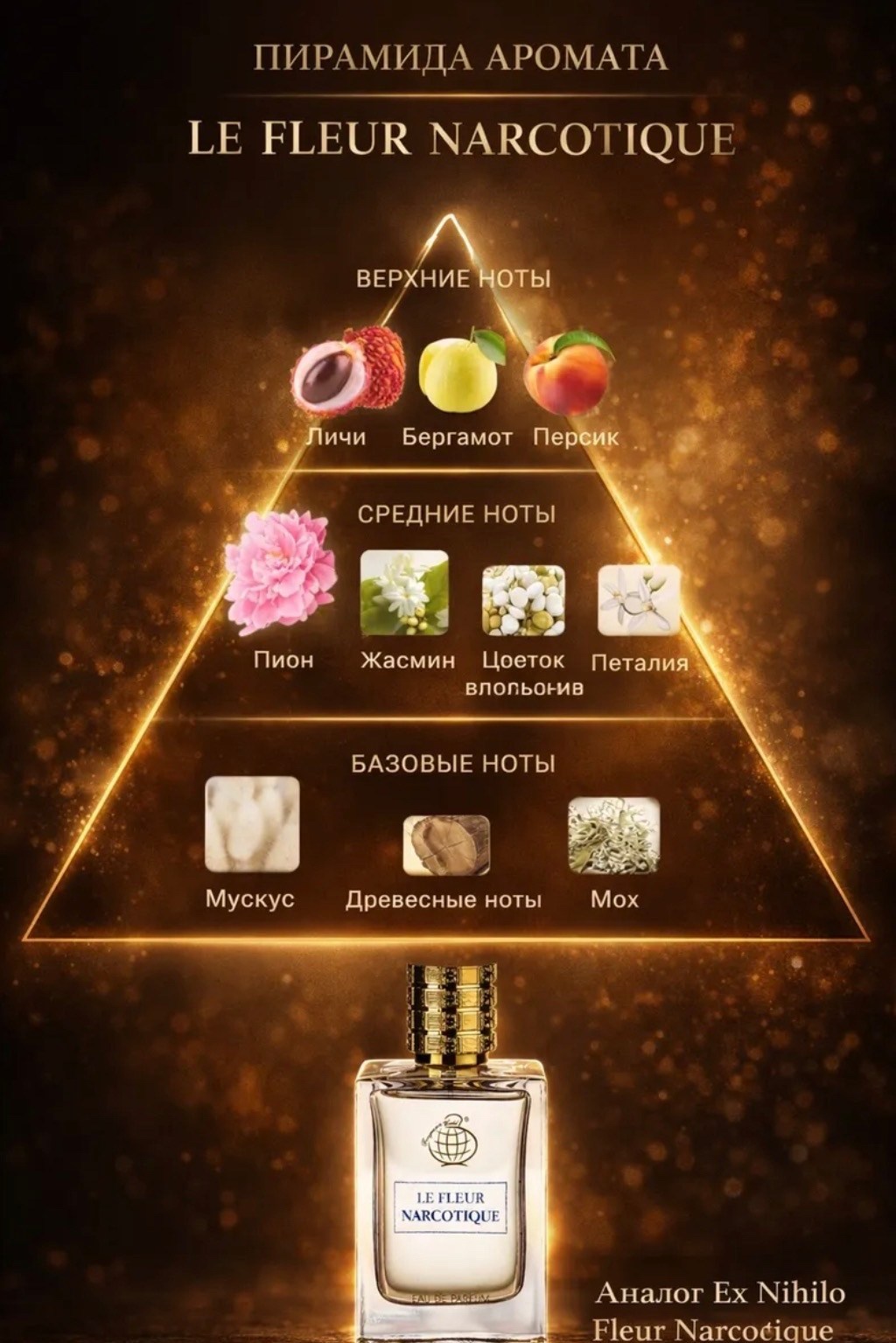 Роскошный аромат целого букета еще влажных от утренней росы цветов обволакивает медовым апельсиновым цветом, терпковатым жасмином и тонким, элегантным запахом пиона Цветочный аккорд звучит на фоне ласковой свежести бергамота, придавая композиции особую красоту и горьковатую терпкость белых цветов Богатый бархатистый аромат спелого медового персика и нежный запах личи добавляют композиции глубину и объемность, присущие ароматам благоухающего сада Теплая, бархатистая база ex nihilo fleur narcotique из древесных нот, пряно-лесного запаха дубового мха и нежнейшего мускуса формирует долгий и волнующий ольфакторный шлейф.