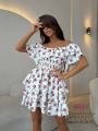 Шифоновое платье с цветочным узором Вырез кармен открывает плечи, украшен оборками Талия на резинке для комфортной посадки Многоярусная юбка создает воздушный и динамичный силуэт.