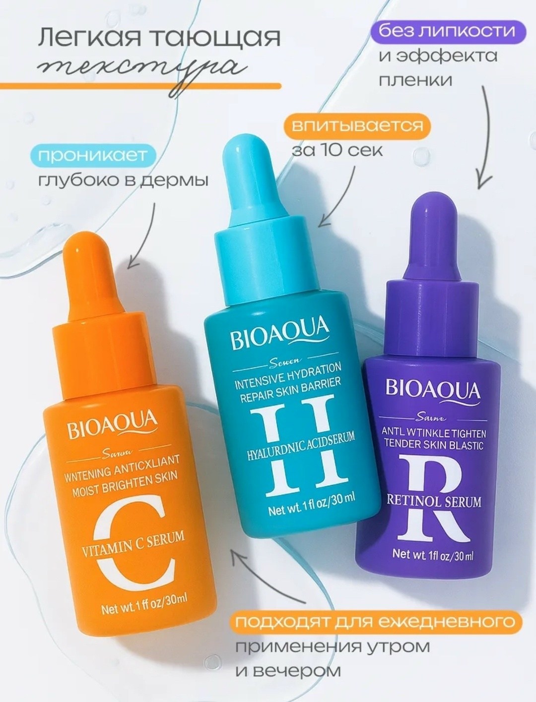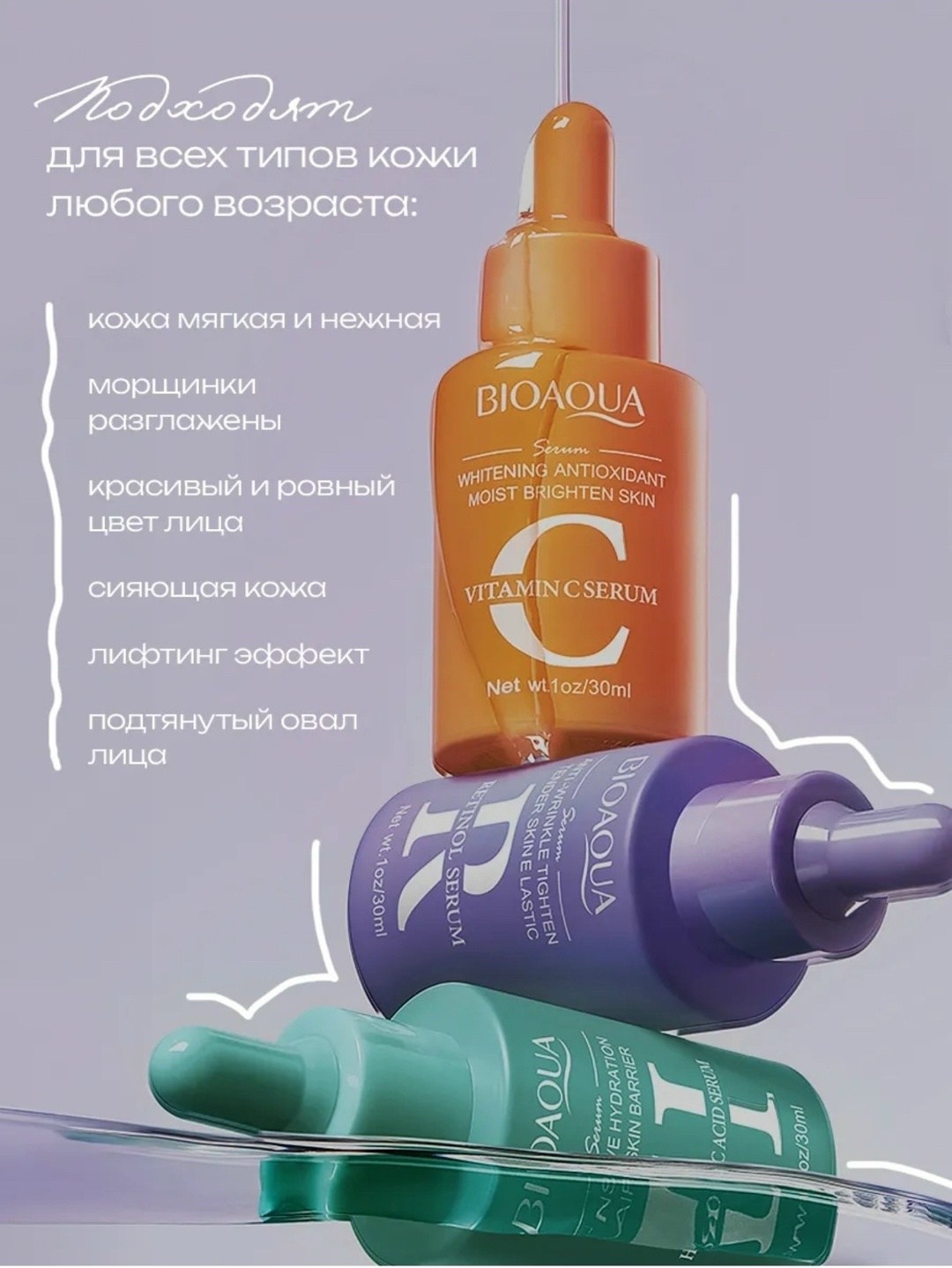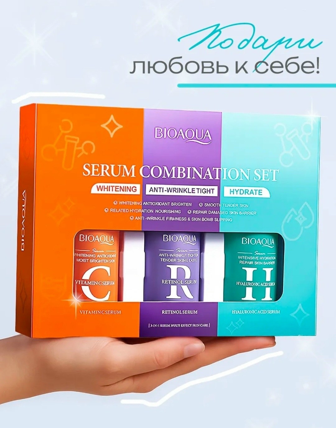 Набор сывороток для лица это прекрасный вариант базового ухода, который закрывает все потребности кожи и помогает устранить ее несовершенства Главное преимущество средств от bioaqua в ультралегкой текстуре, которая комфортно распределяется и быстро впитывается без липкого слоя Сыворотки можно использовать как базу под макияж, чтобы косметика держалась дольше, а кожа была защищена от агрессивных внешних факторов В набор ухода за лицом входит три сыворотки Антивозрастная с ретинолом порадует вас выраженным омолаживающим эффектом Она сокращает мимические морщины, улучшает рельеф и тон кожи Благодаря заметному лифтинг-эффекту черты лица становятся более четкими уже после двух недель применения Увлажняющая сыворотка с гиалуроновой кислотой эффективно борется с шелушением и сухостью кожи Питательное касторовое масло в составе продукта улучшает защитные функции и усиливает регенерацию, уменьшает покраснения и число нежелательных высыпаний Восстанавливающая сыворотка с витамином с вернет коже эластичность и упругость Мягкие осветляющие свойства выравнивают тон кожи и дарят ей здоровое сияние Последовательное применение средств набора эффективно против многих несовершенств кожи любого возраста, в том числе подростковой: расширенные поры, черные точки, пигментация, акне и постакне Профессиональные сыворотки для лица как подарочный набор косметики в фирменной упаковке это отличный подарок на 8 марта, 14 февраля или день влюбленных для любимой девушки, жены, мамы, бабушки, сестры, подруги, учителю или для коллег Этот бьюти бокс станет дополнением к ежедневным бьюти-процедурам и прекрасным подарком на день святого валентина (14 февраля) и международный женский день (8 марта.