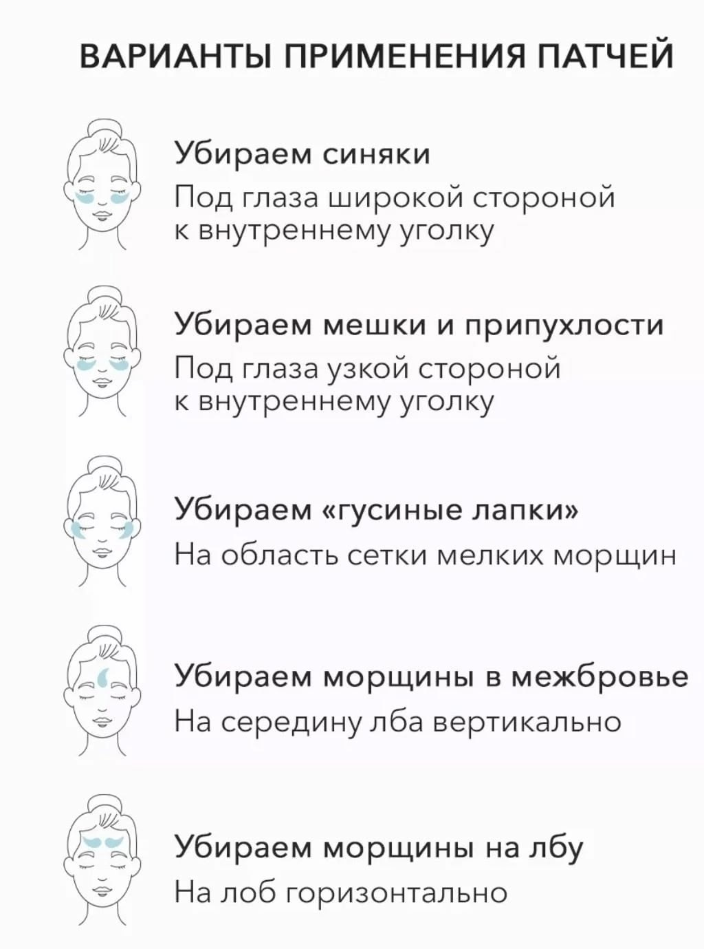 Патчи большие по размеру, вы можете использовать их для разных зон лица: для губ, в области лба, носа, зоны шеи, подбородка и декольте Они эффективно работают с зоной носогубных складок, приподнимают уголок губ и убирают глубокие морщины, прекрасно дополняют тканьевые маски.