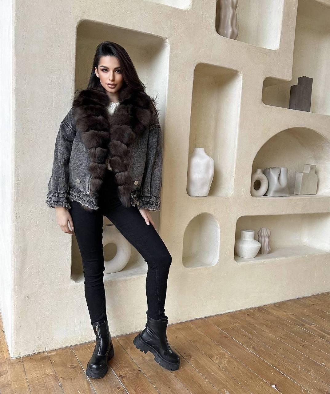 Джинсовая куртка мех песец, утепленная, длина 60 см.