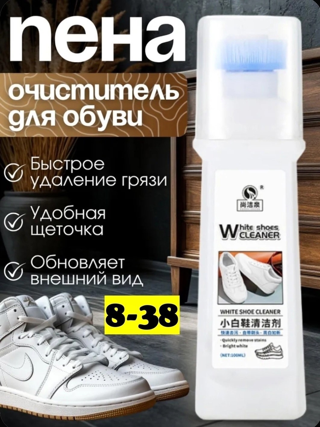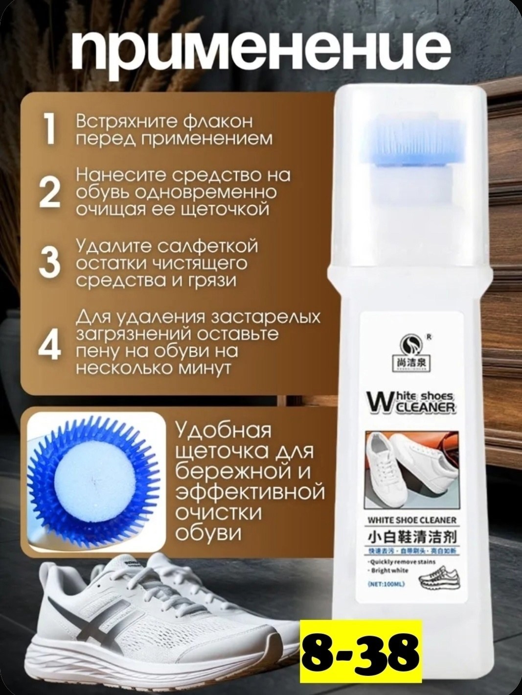 Инновационное средство для чистки белой обуви быстро удаляет загрязнения, желтизну, пятна и возвращает обуви первоначальную яркость без вреда для материала.