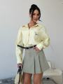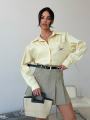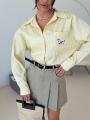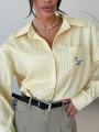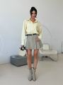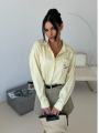 Свежий, как весеннее утро, этот аутфит строится на гармонии Рубашка свободного кроя в тонкую вертикальную полоску визуально вытягивает силуэт, а кокетливая деталь в виде вышитой собаки на кармане добавляет образу ироничности и индивидуальности.
