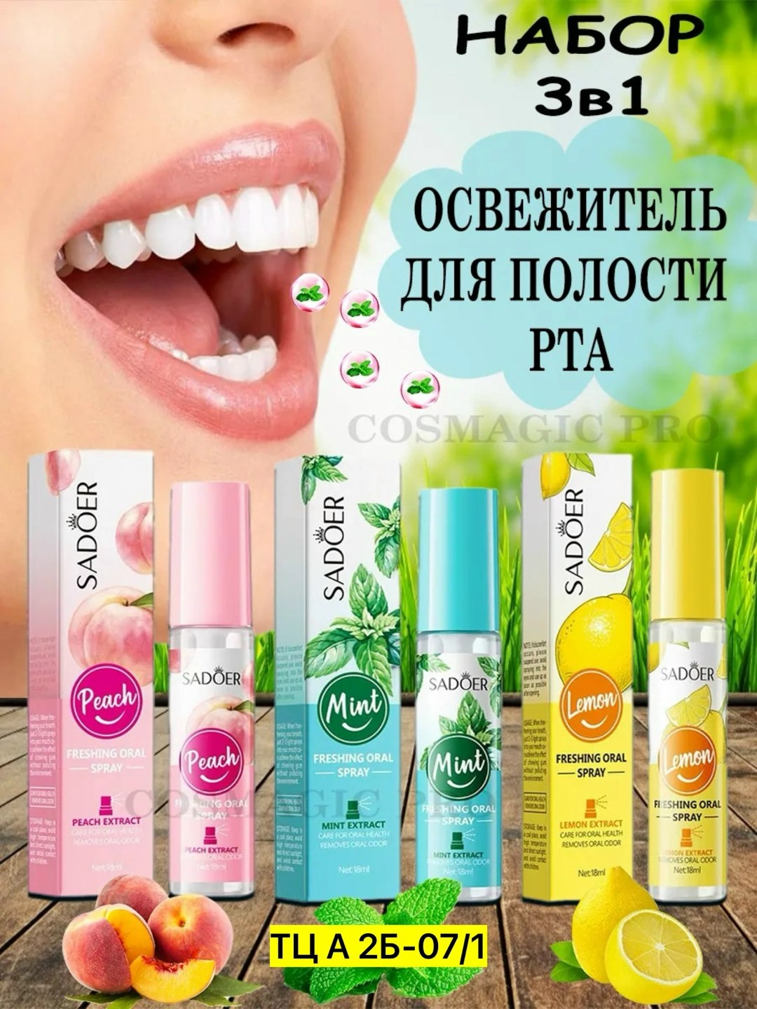 Освежающий спрей для полости рта со вкусом лимона, мяты, персика самый быстрый способ освежить дыхание перед важным событием, деловой встречей или свиданием, заменяющий 10 пачек жевательной резинки Обладает стойким и длительным эффектом защиты от неприятного запаха изо рта после приема пищи, табака, алкоголя Особенно актуален для курящих людей освежитель эффективно устраняет запах сигарет Средство для гигиены полости рта не содержит спирта и сахара Рекомендовано стоматологами в целях профилактики кариеса, снижения кровоточивости и чувствительности десен, а также воспаления после удаления зубов и других стоматологических процедур Увлажняет слизистую оболочку полости рта Ксилитол в составе подавляет развитие кариесогенных бактерий, образование зубного налета и зубного камня.