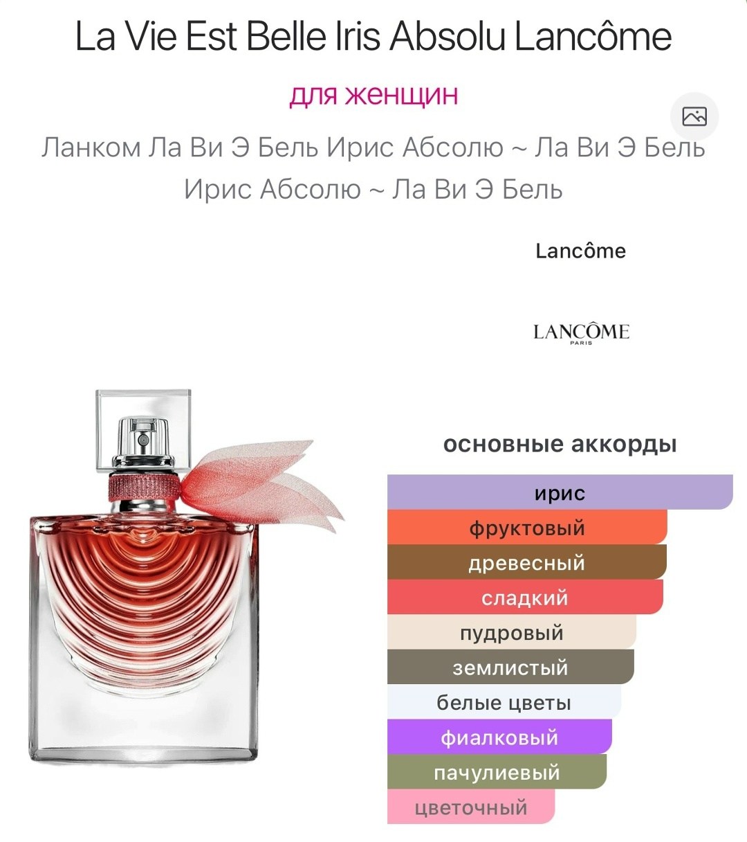 Аромат lancome la vie est belle iris absolu 2014 сладкий цветочно-фруктовый женский аромат, выпущенный в 2023 году французским брендом lancome Это очередное дополнение к линейке фланкеров популярного парфюма la vie est belle 2012 года Ароматическая композиция задумана, как дань красоте жизни, дарящая ощущение счастья и благополучия Аромат для женщин, которые хотят подчеркнуть свою уникальную индивидуальность и стиль.