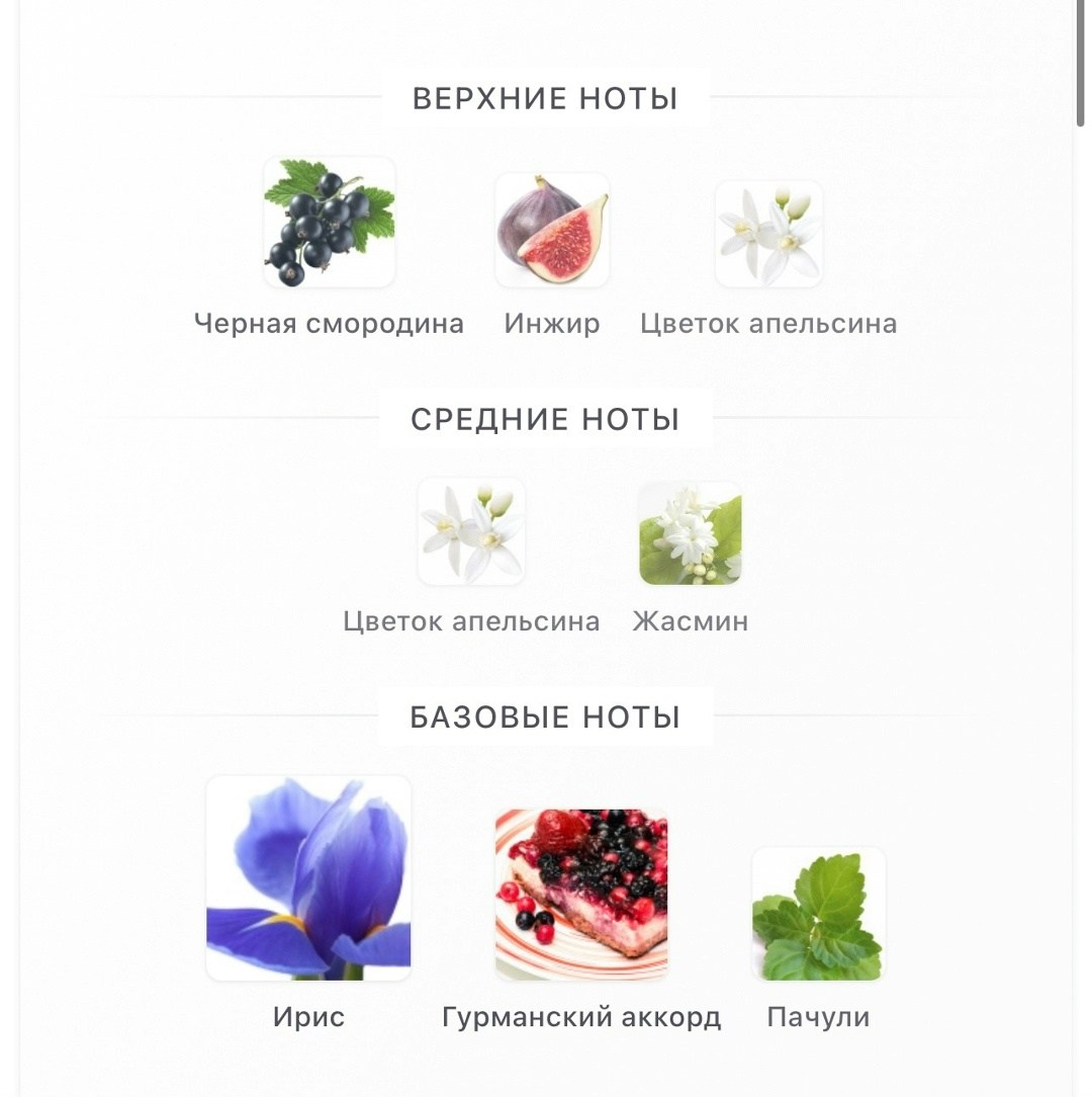 Ноты: черная смородина, жасмин, пачули, инжир, ирис, апельсин.