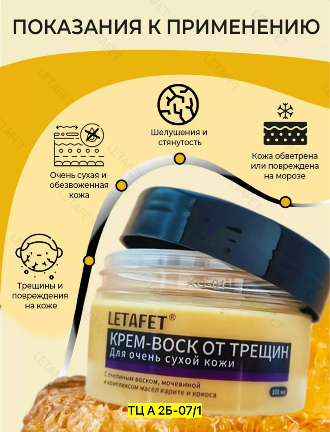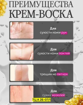Крем воск от трещин для очень сухой кожи Крем универсальный от сухости и шелушений В составе пчелиный воск создает на коже защитную пленку, заполняет трещины и раны, увлажняет, смягчает и предотврает сухость кожи.