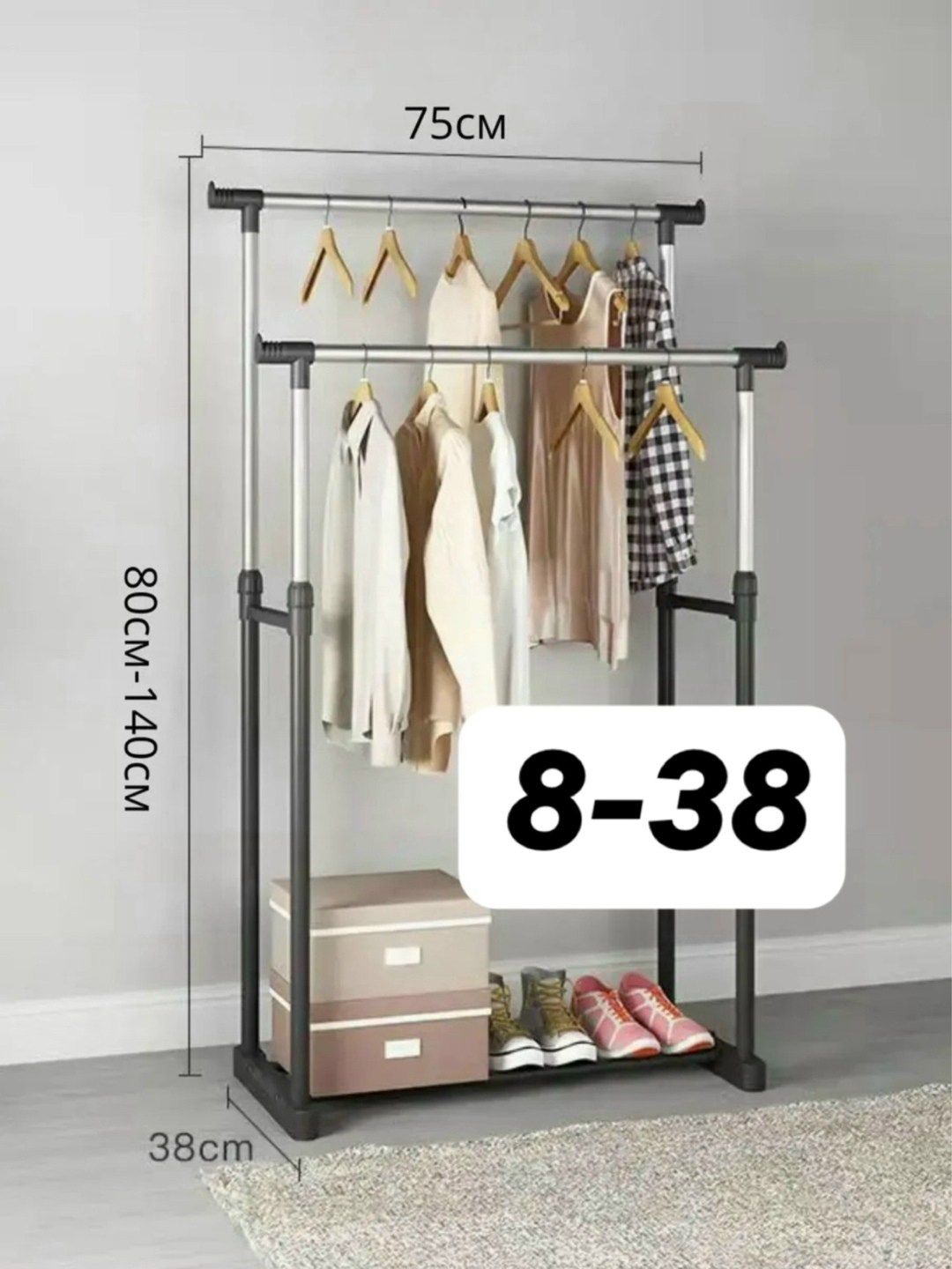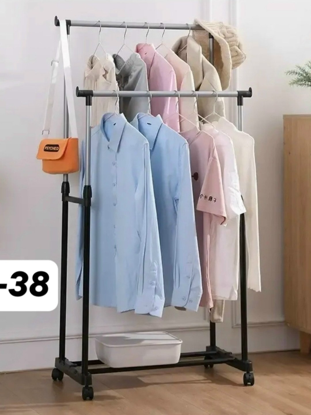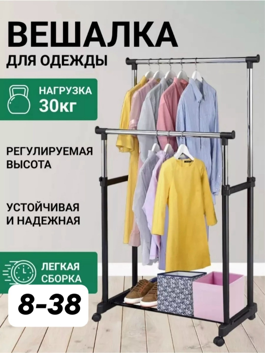 Прочная основа стойки с легкостью выдерживает вес до 30 кг и может вместить до 50 вешалок с рубашками, платьями и с верхней одеждой.