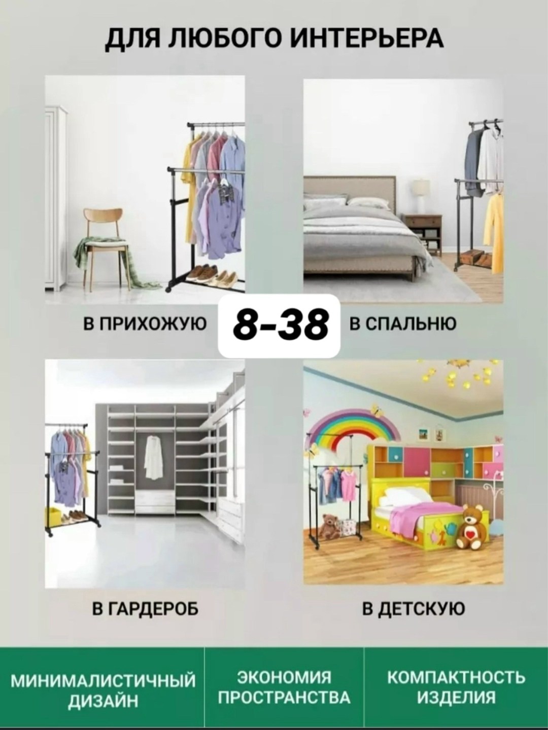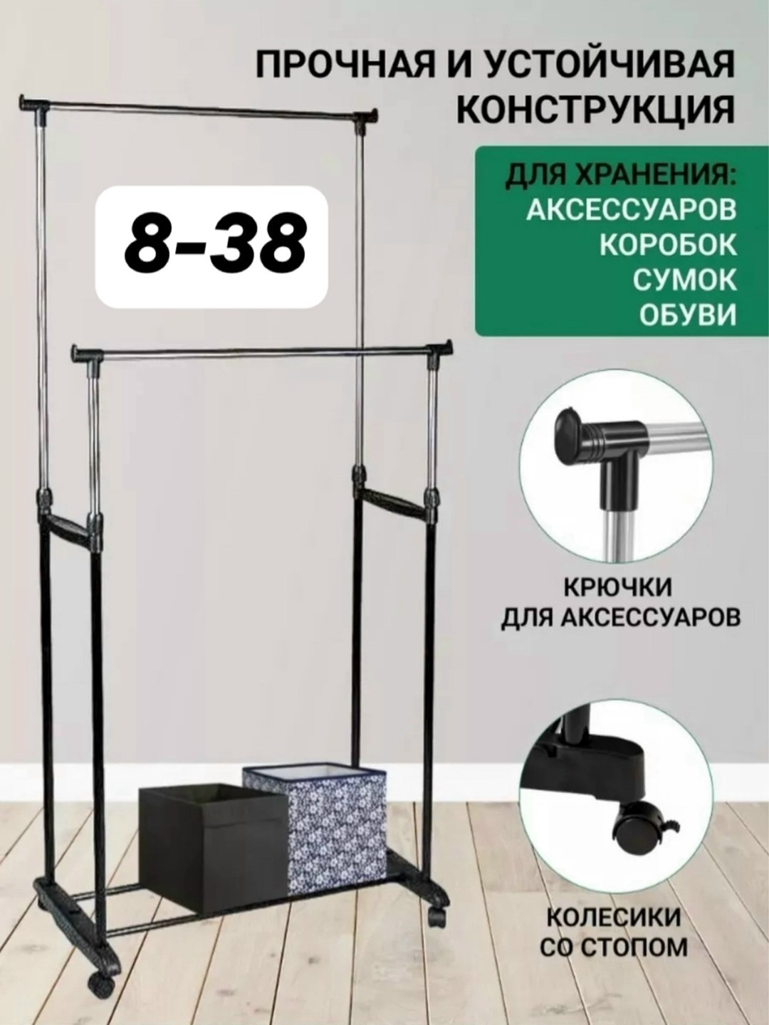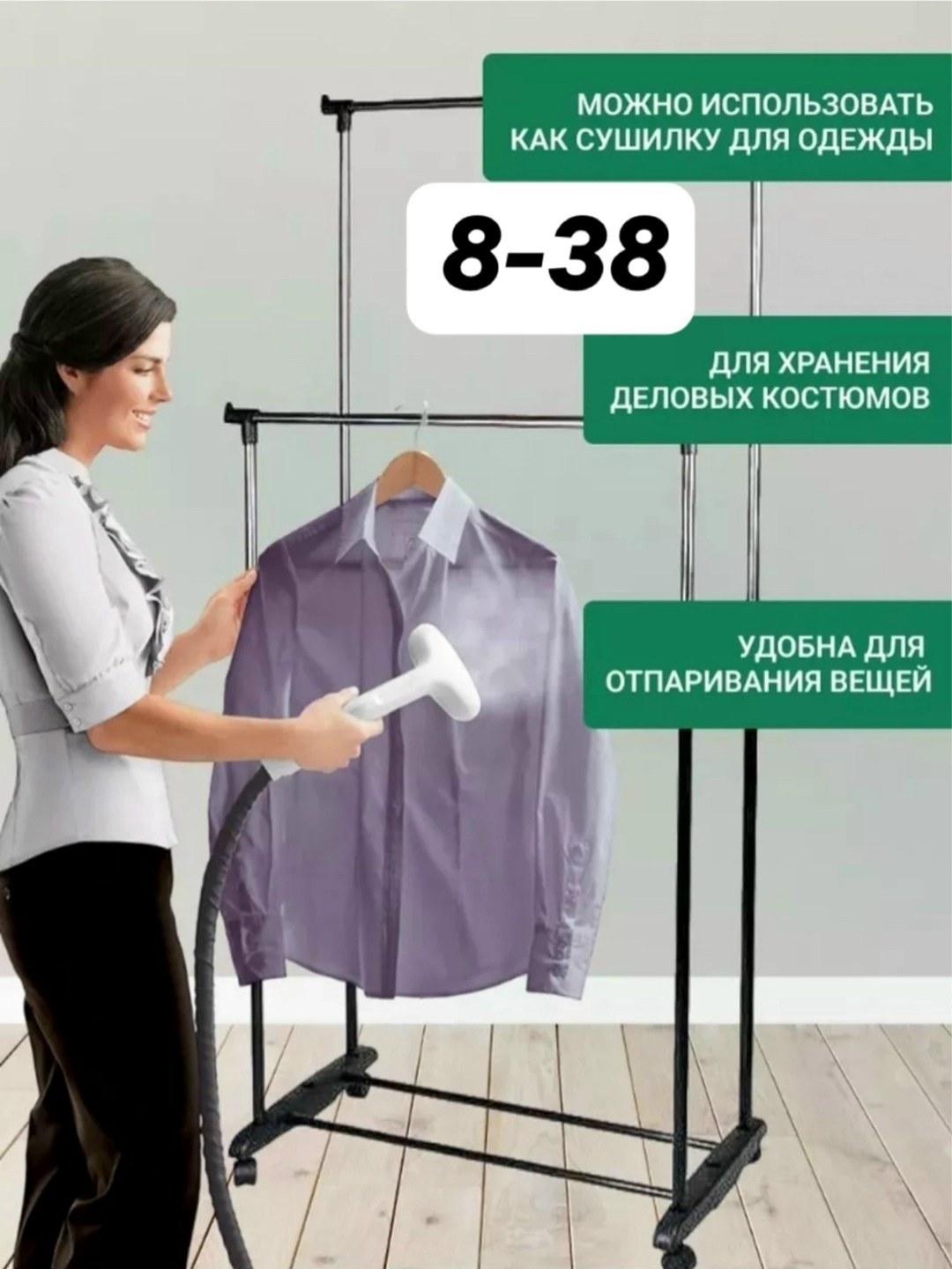 Прочная основа стойки с легкостью выдерживает вес до 30 кг и может вместить до 50 вешалок с рубашками, платьями и с верхней одеждой.