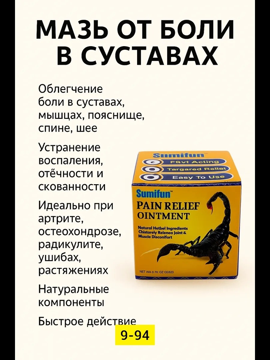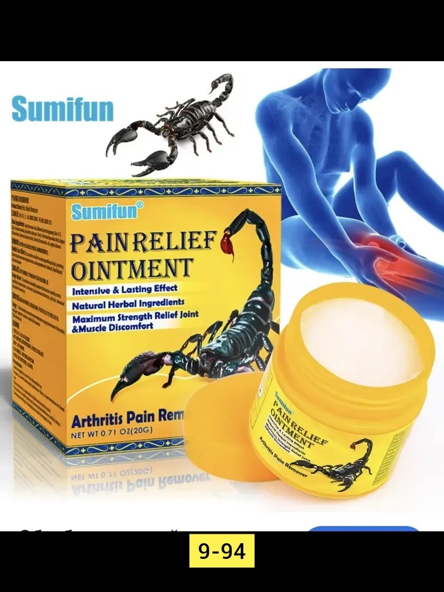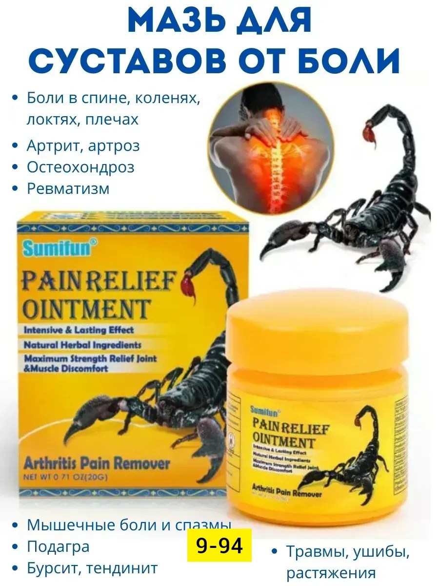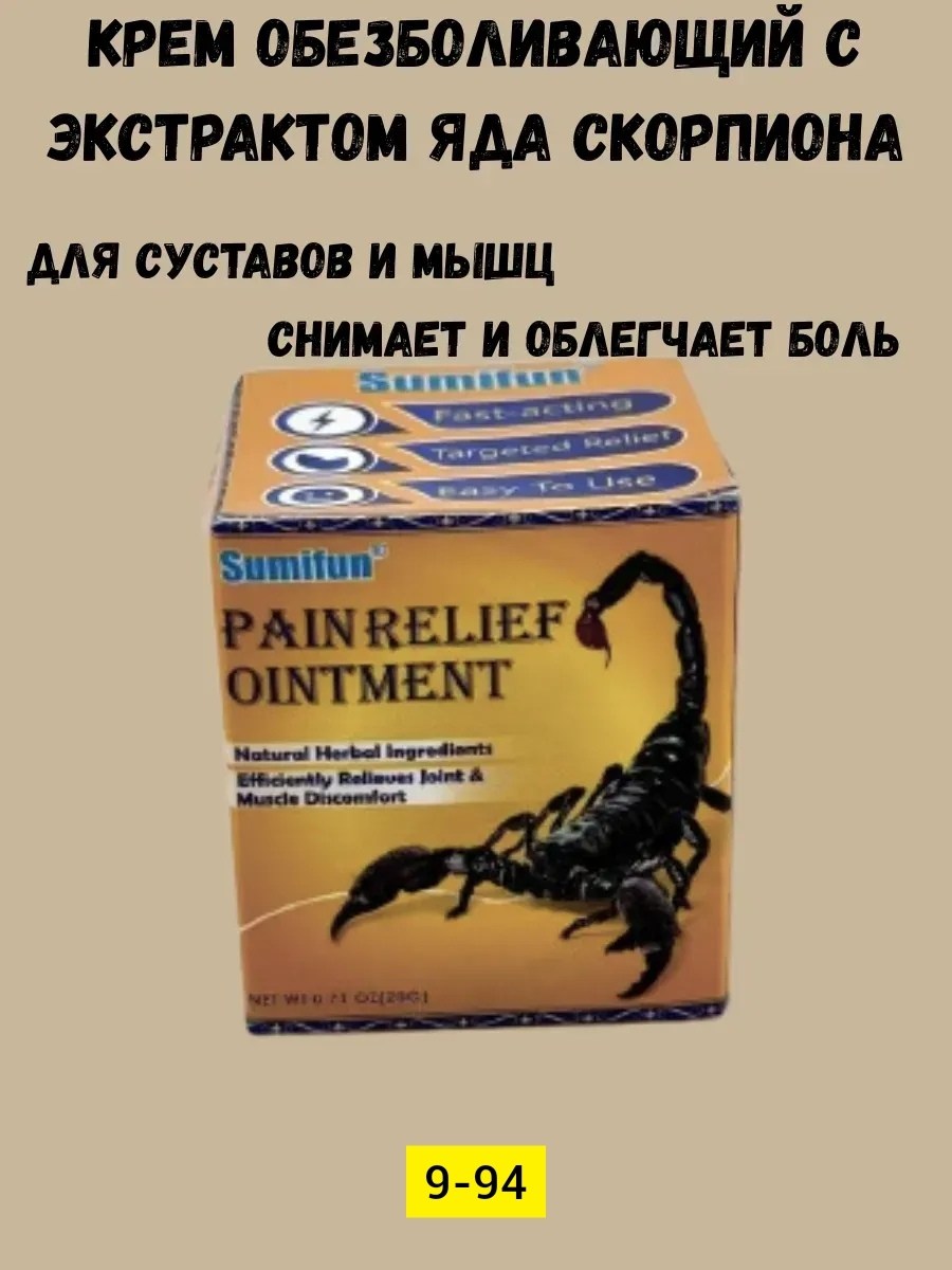 Обезболивающая мазь - это высокоэффективный продукт, разработанный для быстрого и направленного снятия болей в суставах, мышцах, спине, шее и при ревматизме Основой формулы являются натуральные травы и компоненты животного происхождения, включая экстракт яда скорпиона,.