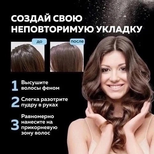 Основная роль пудры придание объема, полноты, упругости прядям(особенно тонким,слабым) Специальные микрочастицы дают нужный эффект без использования фена и других приборов, поэтому укладка по утрам будет занимать минимум времени Это самый быстрый способ придать прическекрасивый и ухоженный вид.