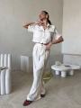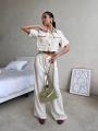 Укороченная рубашка оверсайз и брюки на пуговицах.