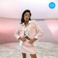 Трендовый костюм-двойка, представленный на изображении, состоит из укороченного пиджака и юбки миди.
