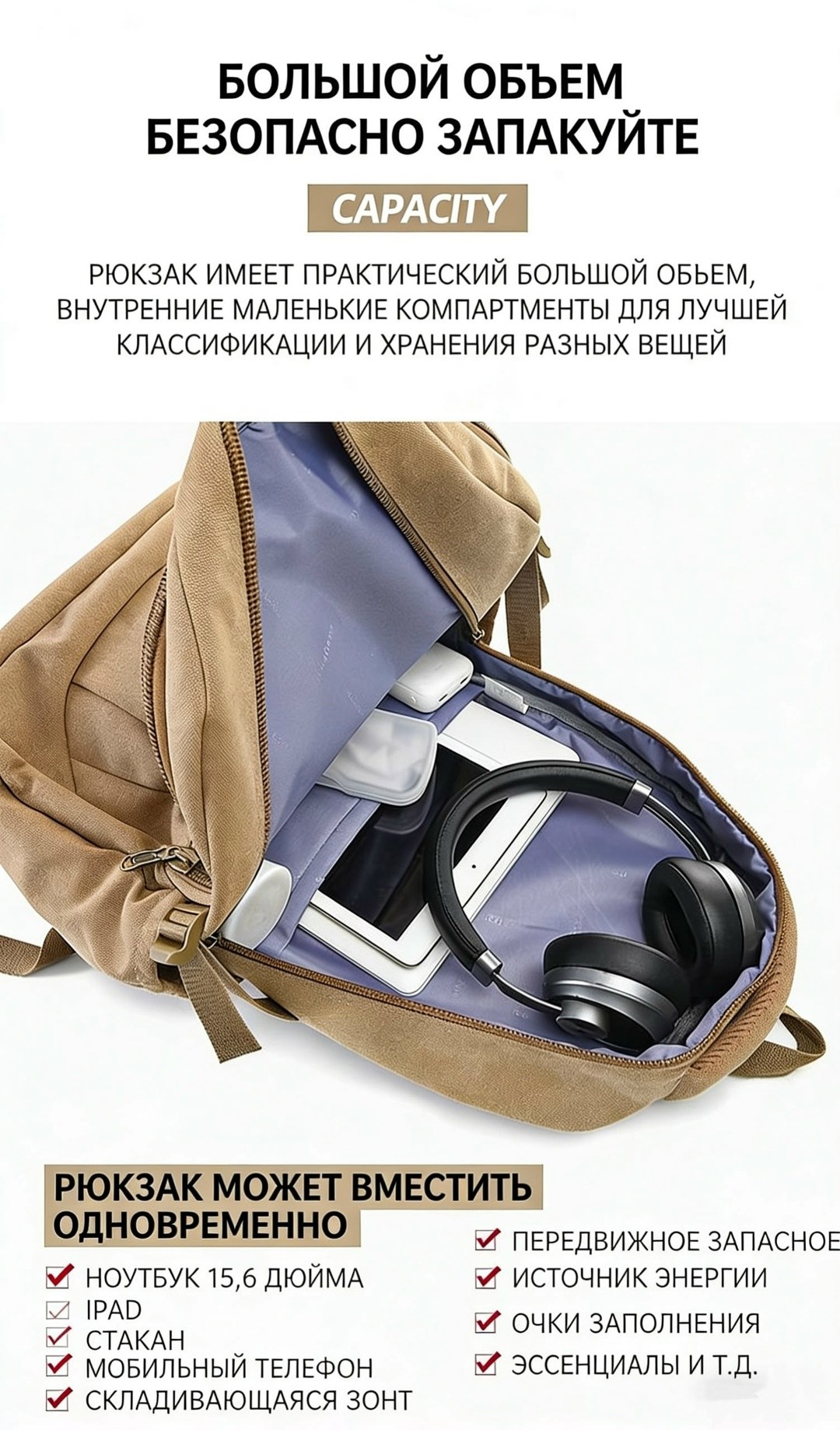2 Оптимальные размеры 503319 см вместительный, но не громоздкий, подходит для ноутбука, одежды, документов и других необходимых вещей.