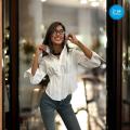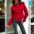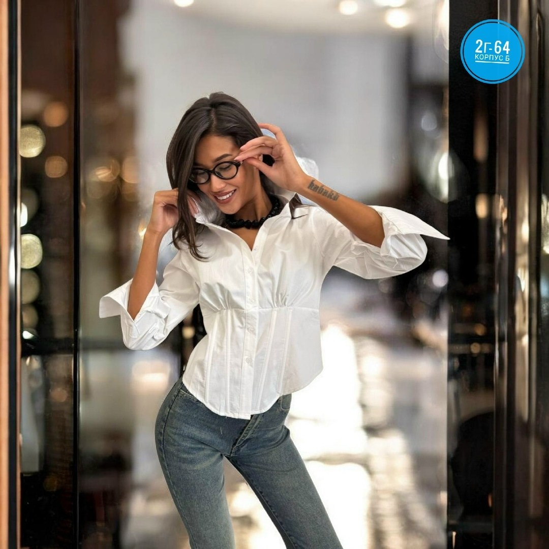 Представлена женская рубашка с длинными рукавами, выполненная в светлом цвете Особенностью модели является присборенная талия, которая завязывается на шнурок, создавая акцент на талии и добавляя образу женственности.