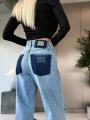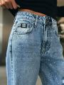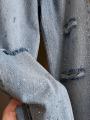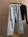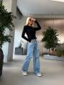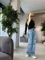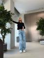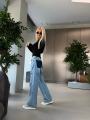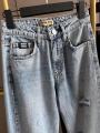 Джинсы miu miu premium качества, широкая модель светло - голубого цвета с эффектом потертости и декоративными разрезами, украшения со страз создает эффект мерцания, высокая посадка хорошо подчеркивает талию.