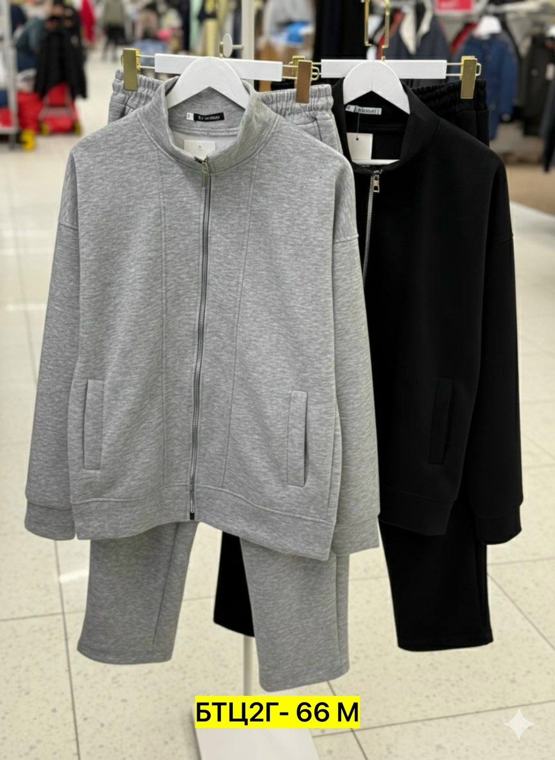 Дизайн: свободный фасон (oversize), куртка на молнии с высоким воротником и прямые комфортные брюки.