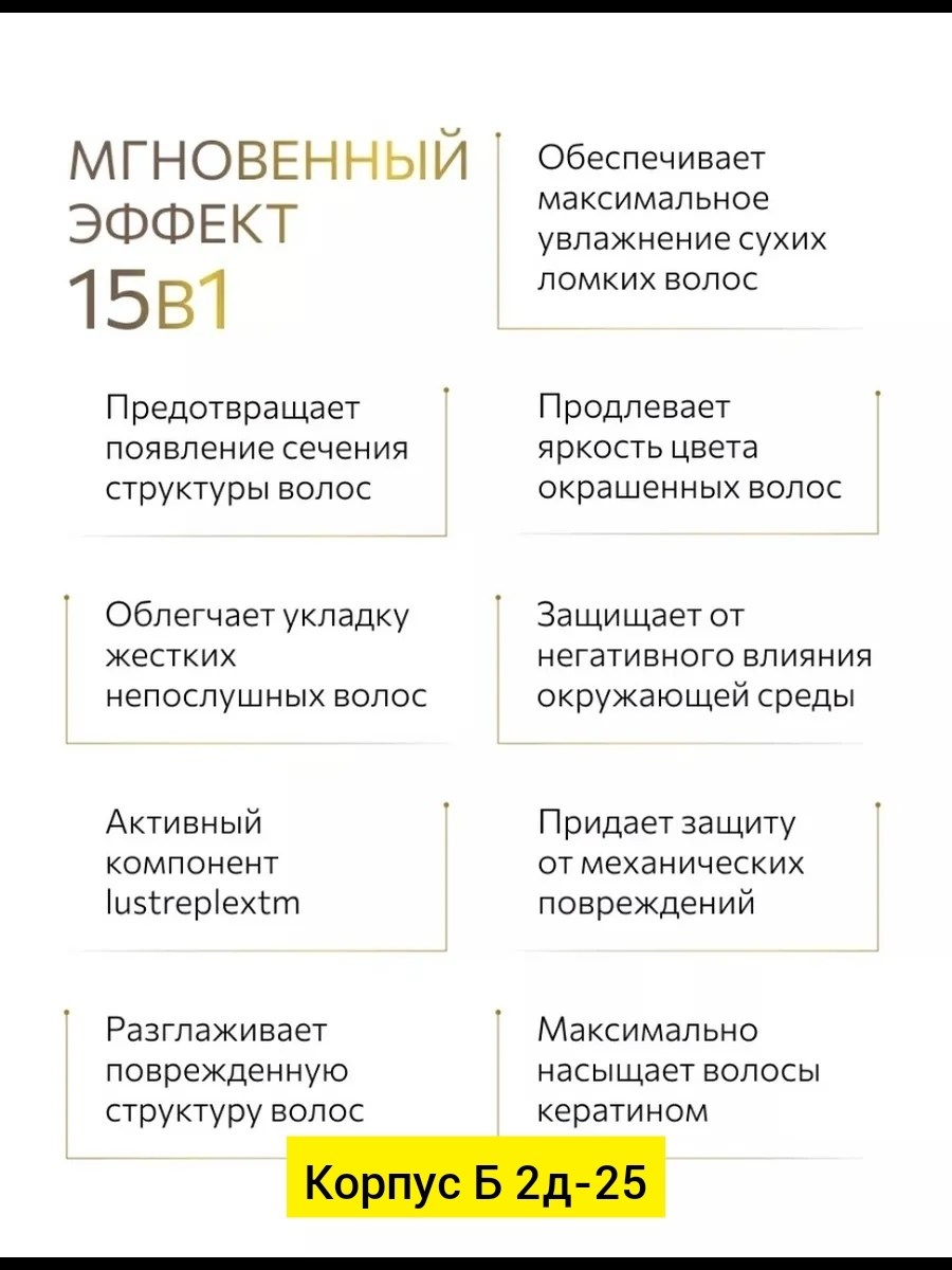 Это инновационное рещение, которое сочетает в себе сразу 15 эффектов, обеспечивая полноценный уход в одном флаконе.