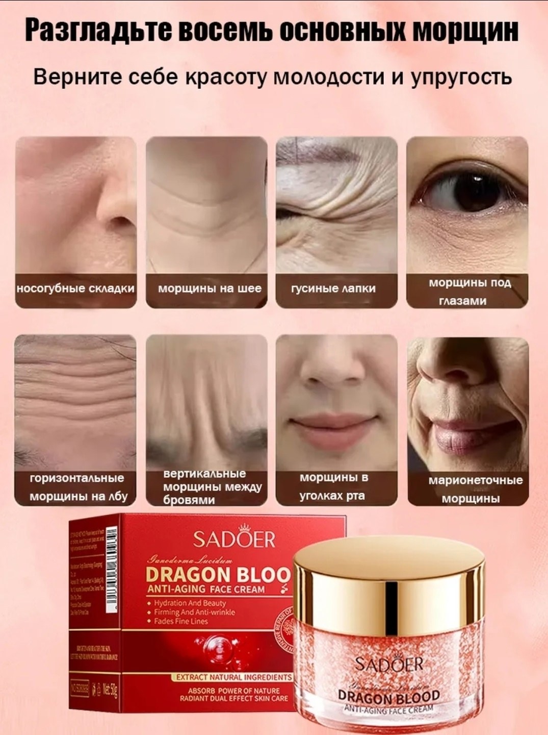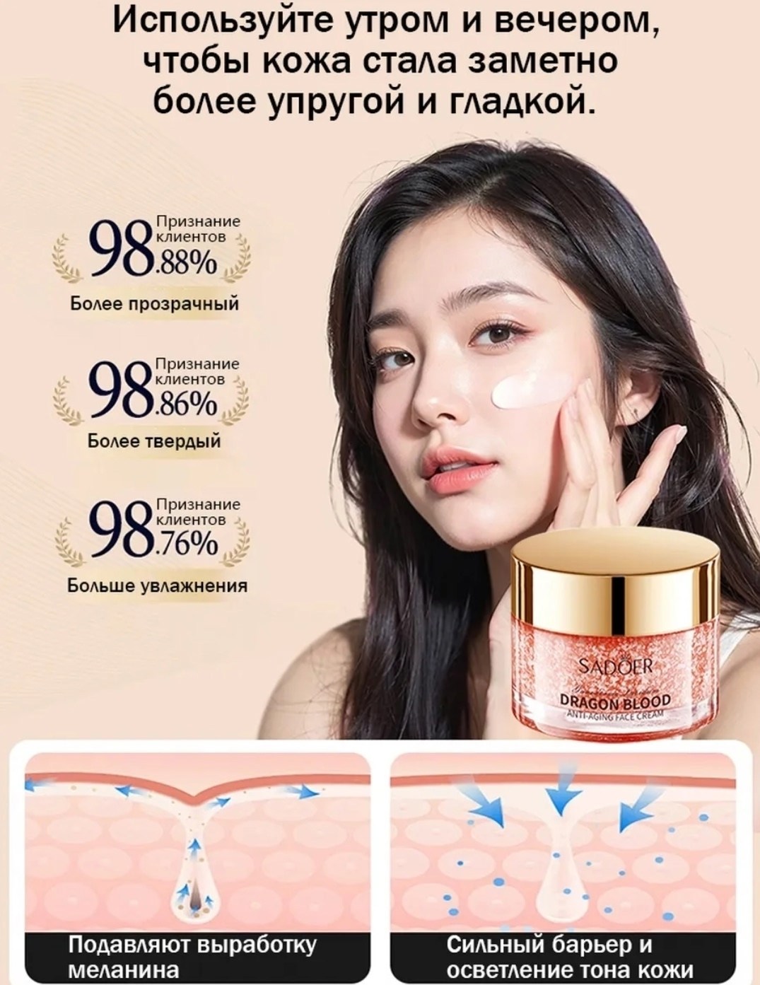 Крем с экстрактом драконьей крови это уникальный увлажняющий и омолаживающий крем, предназначенный для борьбы с признаками старения Его активная формула, обогащенная природными компонентами, помогает улучшить упругость кожи, уменьшить морщины и восстановить е здоровье Экстракт драконьей крови, известный своими антиоксидантными и регенерирующими свойствами, помогает укрепить кожу и стимулировать е обновление, придавая лицу свежий и сияющий вид Особенности: экстракт драконьей крови: обладает мощными антиоксидантными свойствами, стимулирует обновление клеток, укрепляет кожу и уменьшает видимость морщин; увлажнение и питание: крем интенсивно увлажняет и питает кожу, предотвращая е пересыхание и делая е более мягкой и эластичной; антивозрастной эффект: снижает глубину морщин и предотвращает образование новых, улучшая упругость и тонус кожи; подходит для всех типов кожи: крем бережно ухаживает за кожей, подходит как для зрелой, так и для молодой кожи, предотвращая преждевременные признаки старения; легкая текстура: быстро впитывается, не оставляя жирных следов, идеально подходит для использования в любое время дня Используйте крем ежедневно, чтобы обеспечить своей коже интенсивный уход, восстановление и защиту от внешних воздействий.