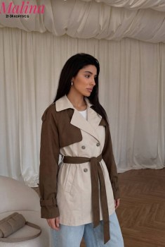 Стильный двухцветный тренч с акцентным кроем и поясом в комплекте Эффектная модель для тех, кто любит выделяться и собирать трендовые образы.