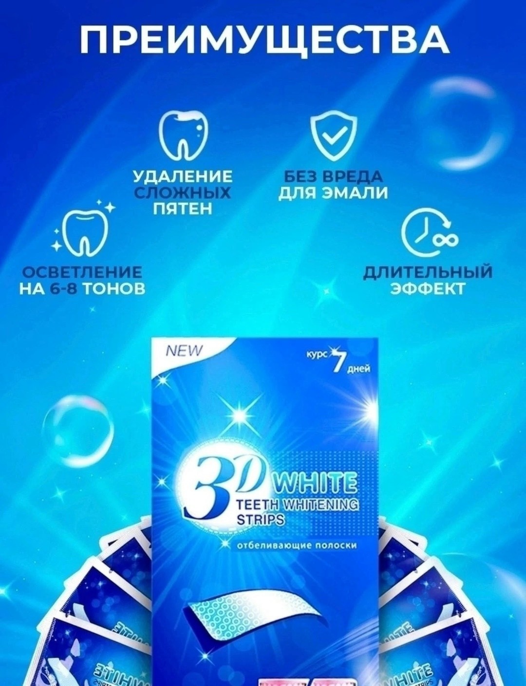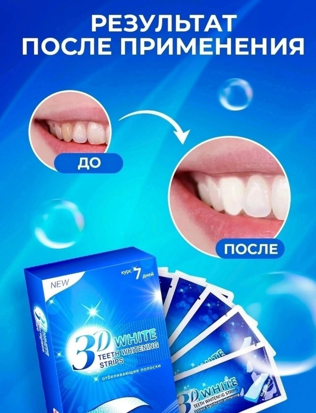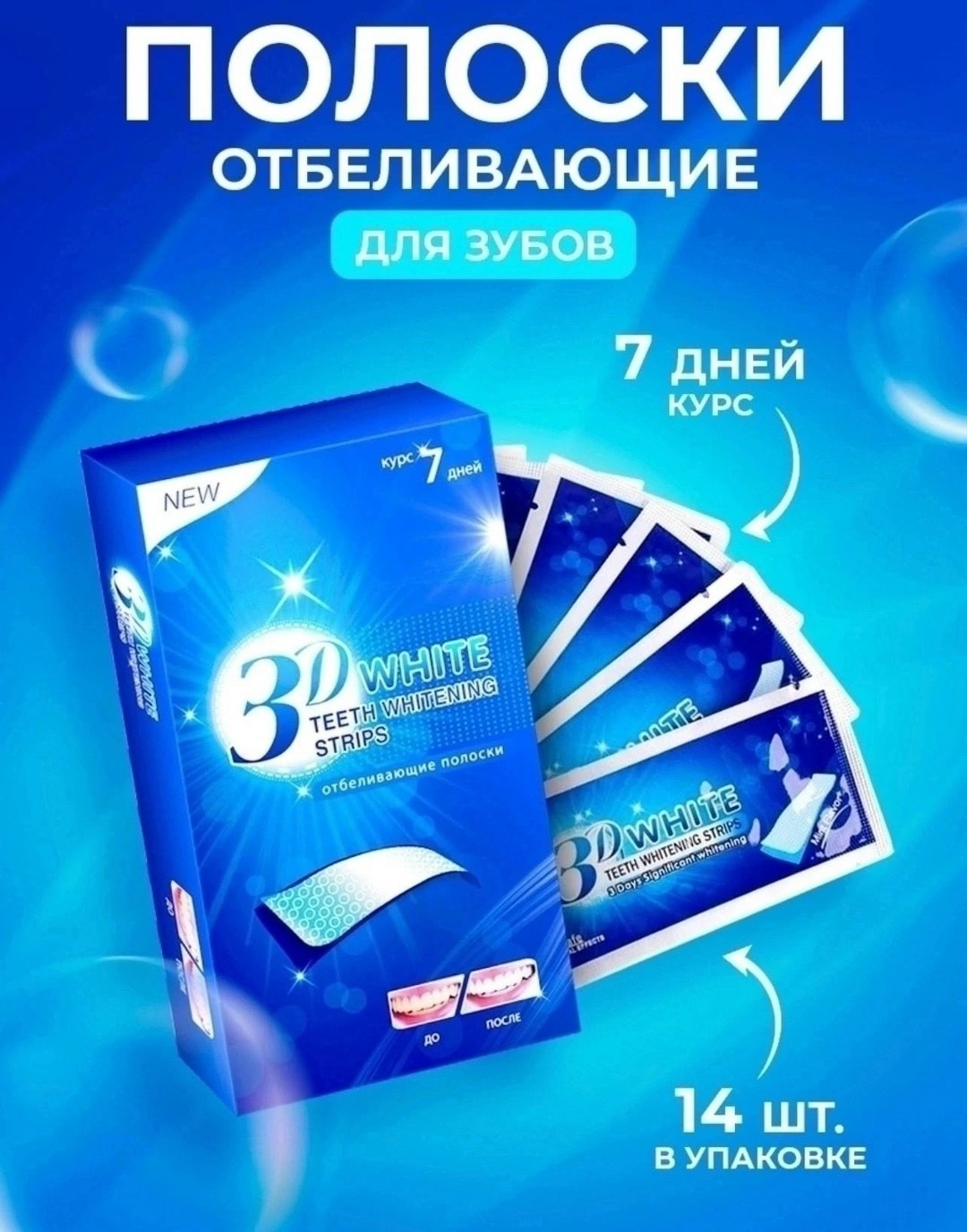 Отбеливающие полоски для зубов 3d white teeth whitening stripes коплект на 7 дней Эффективный и безопасный способ сделать свою улыбку белоснежной Отбеливающие полоски убирают тмный налт от кофе, табака и красящих продуктов, освежают дыхание и не вызывают болезненного ощущения даже на чувствительной эмали Стойкий эффект-до 12 месяцев Благодаря высокой эластичности полосок отбеливание стало максимально эффективным Способ приминения: 1 Извлеките полоски Откройте фольгу и тщательно отделите полоски от подкладки Каждый пакет из фольги содержит две отбеливающие полоски - для верхнего и нижнего набора зубов 2 Нанесите гелевую сторону отбеливающей полоски на зубы Нажмите на полоску, чтобы она приняла форму ваших зубов 3 Удалите, подогните излишки ленты за зубами, чтобы помочь сохранить полоску на месте Тщательно удалите каждую полоску через 30 минут, прополоскайте рот водой и удалите остатки геля с зубов, с помощью пальца или зубной щетки.