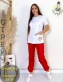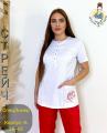 Состоит из блузы с коротким рукавом с принтом и брюк.