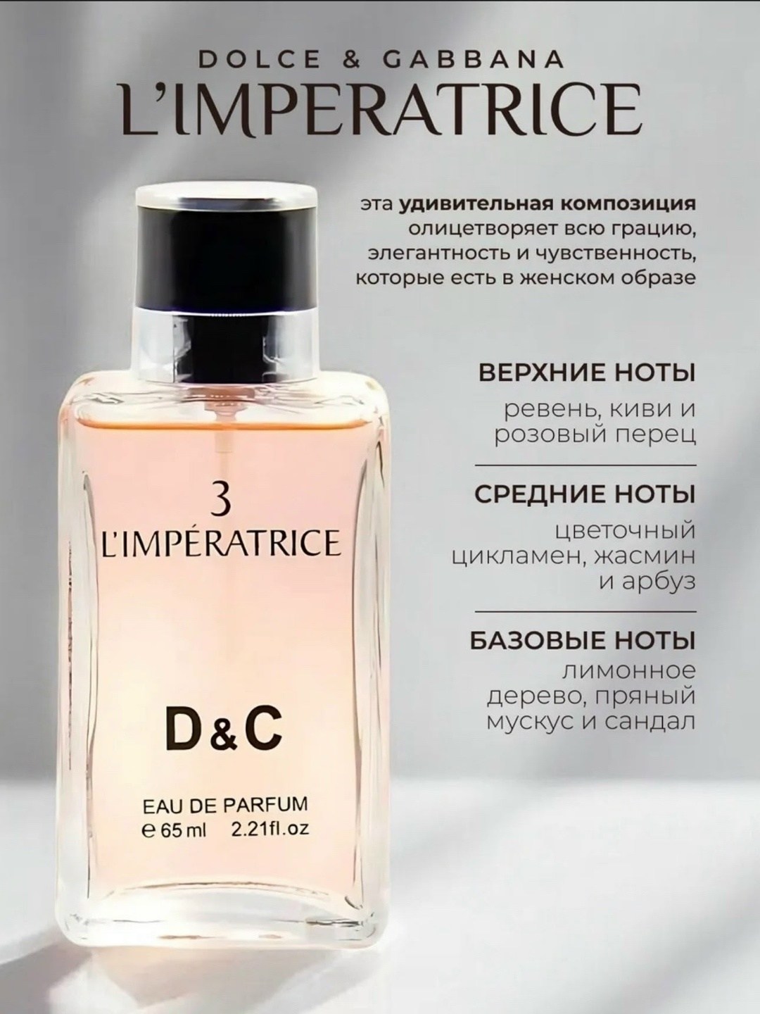 В яркой парфюмерной композиции limperatrice сливаются энергичные и женственные, нежные и чувственные полутона Прохладный фруктовый коктейль из спелого киви и кисловатого ревеня согревает щепотка пряного розового перца Озоновую свежесть арбузной мякоти окутывают лепестки цикламена и жасмина Солнечные лимонные искры мягко пробиваются сквозь бархатистую древесно-мускусную вуаль.