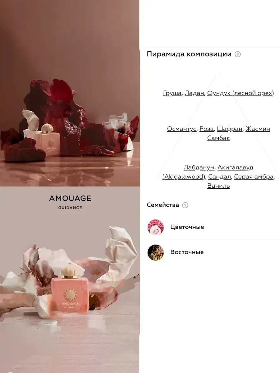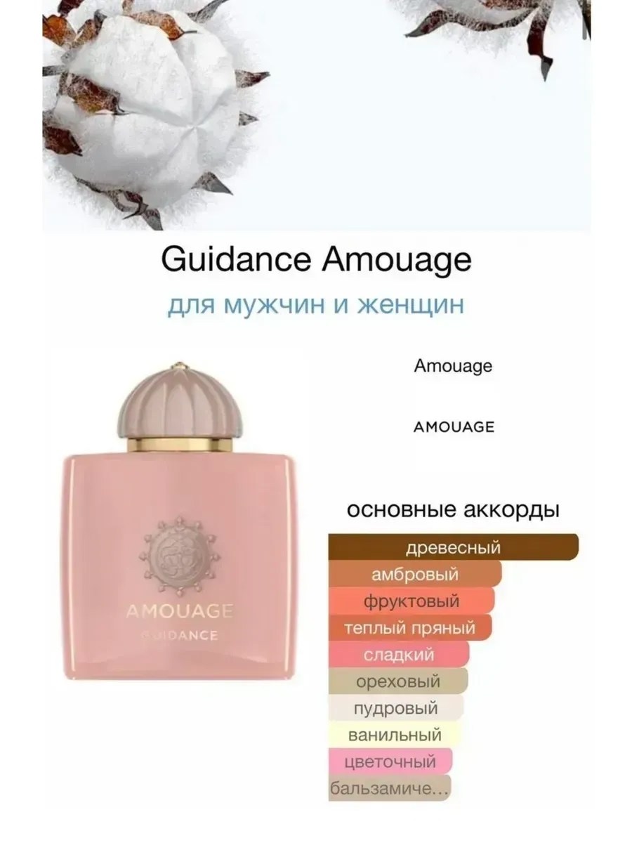 Элитные духи amouage guidance 100мл ( элитный парфюм амуаж гайденс ) красивый и чувственный восточно-цветочный парфюм, выпущенный в 2022 году арабским парфюмерным брендом amouage Это новая завораживающая интерпретация триады amouage из розы, ладана и амбры Guidance читается как стихотворение, пахнет объятиями и ощущается как слово мудрости В верхнем аккорде парфюма guidance аромат медовой груши соединяется с тонким запахом фундука и почти мистическим дымно-ароматическим ладаном В сердце композиции звучит яркий букет цветочных нот душистого жасмина самбака, пряного османтуса, пьянящего шафрана и медовой розы А завершают звучание парфюма древесно-сливочные оттенки сандала, ладан, сладость ванили и смолистая амбра Особую красоту композиции amouage guidance придает молекула акигалавуда с ярким звучанием нот пачули, агаровой древесины и перца Парфюм подчеркнет вашу неповторимую индивидуальность и придаст вам уверенности в любой ситуации Наслаждайтесь этим роскошным ароматом на протяжении дня и каждый раз будьте готовы занять центр внимания.