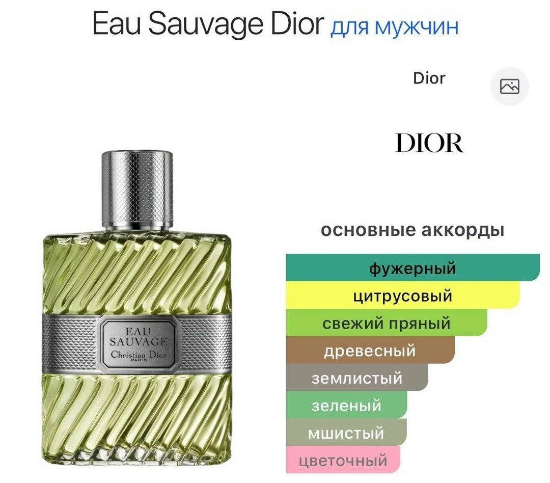 Eau sauvage dior мужской цитрусово-фужерный аромат 1966 года Парфюмер: edmond roudnitska Верхние ноты: лимон, бергамот, базилик, розмарин, тмин, фрукты Средние: жасмин, кориандр, гвоздика, пачули, ирис, сандал, роза, лаванда, гедион Базовые: дубовый мох, ветивер, мускус, амбра.