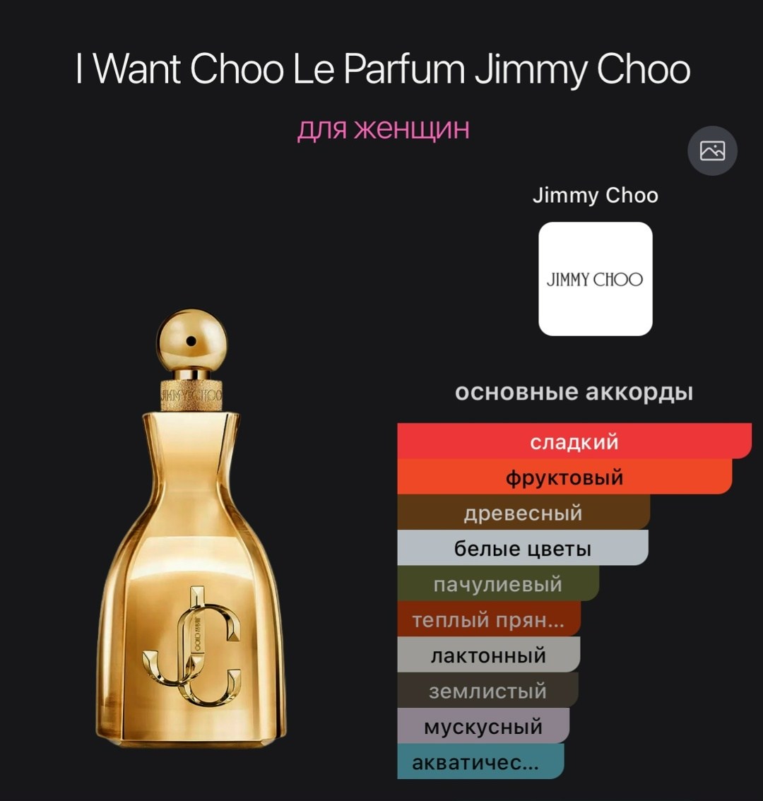 I want choo le parfum от jimmy choo это новинка 2024 года, представляющая собой насыщенную цветочно-древесную композицию с нотами груши, жасмина и сандала Этот роскошный парфюм обеспечивает высокую стойкость, являясь более интенсивной версией классической линейки.