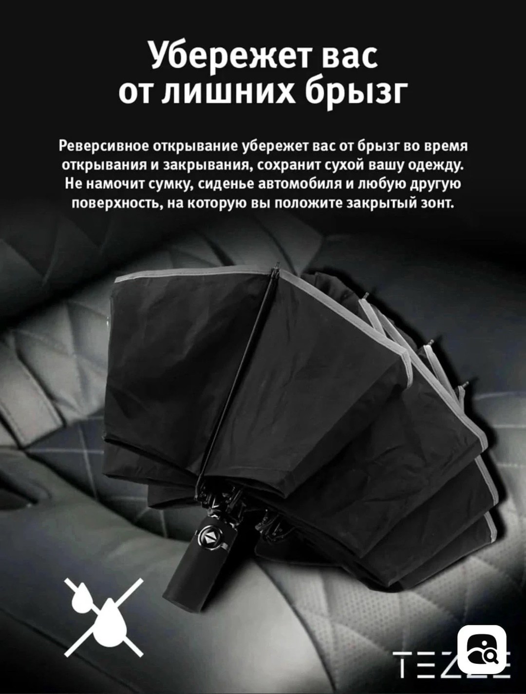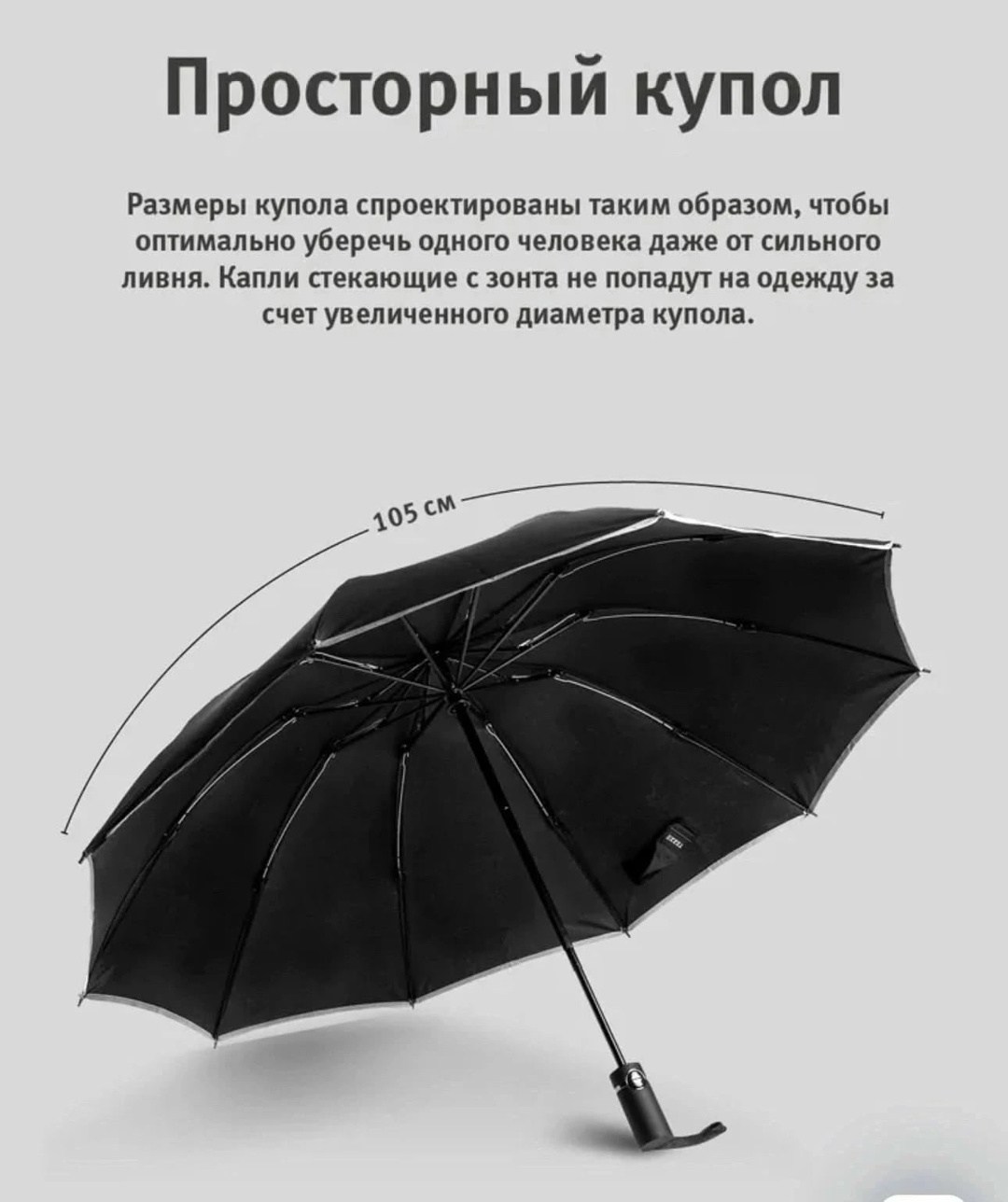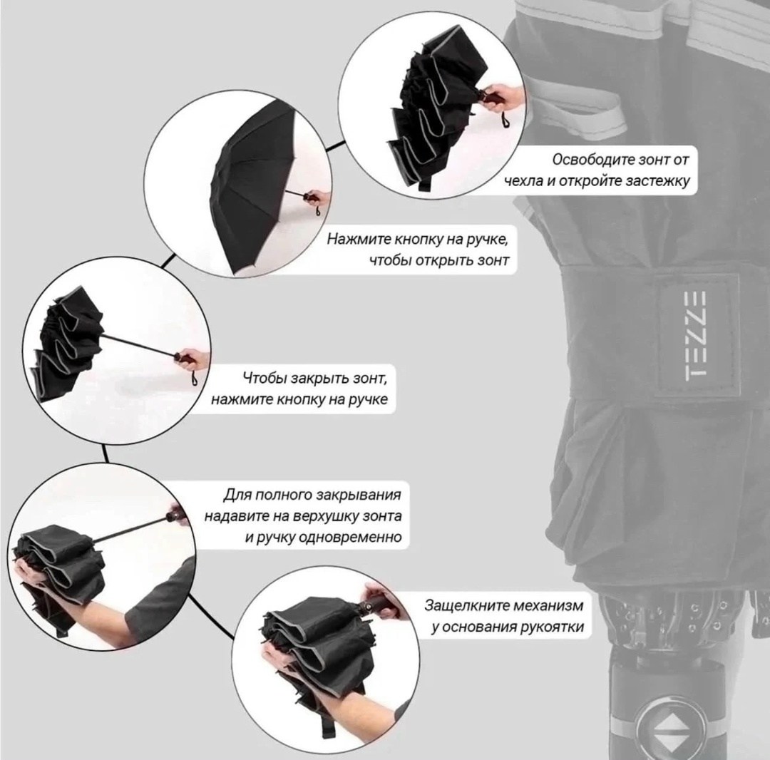 Зонт усиленной конструкции Материал купола эпонж складывается в обратную сторону - зеркально стандартному механизму Такой тип складывания имеет преимуществ: капли дождя остаются внутри внешнего отделения в сложенном виде, что позволит сложить зонт и не намочить одежду Механизм: автомат, 3 сложения, открывается и закрывается кнопкой Конструкция зонта - это комплекс из девяти высокопрочных стальных 9 спиц с антикоррозийным покрытием Купол - размером 105 см с системой антиветер, имеет три сложения В комплекте идет чехол для зонта Такой зонт будет отличным подарком девушке, жене, мужчине маме или коллеге на праздник Обратный зонт имеет светоотражающую окантовку, что сделает вас заметными в темное время суток Наш автоматический зонт имеет наджную конструкцию и хорошо показывает себя в ветренную пагода.