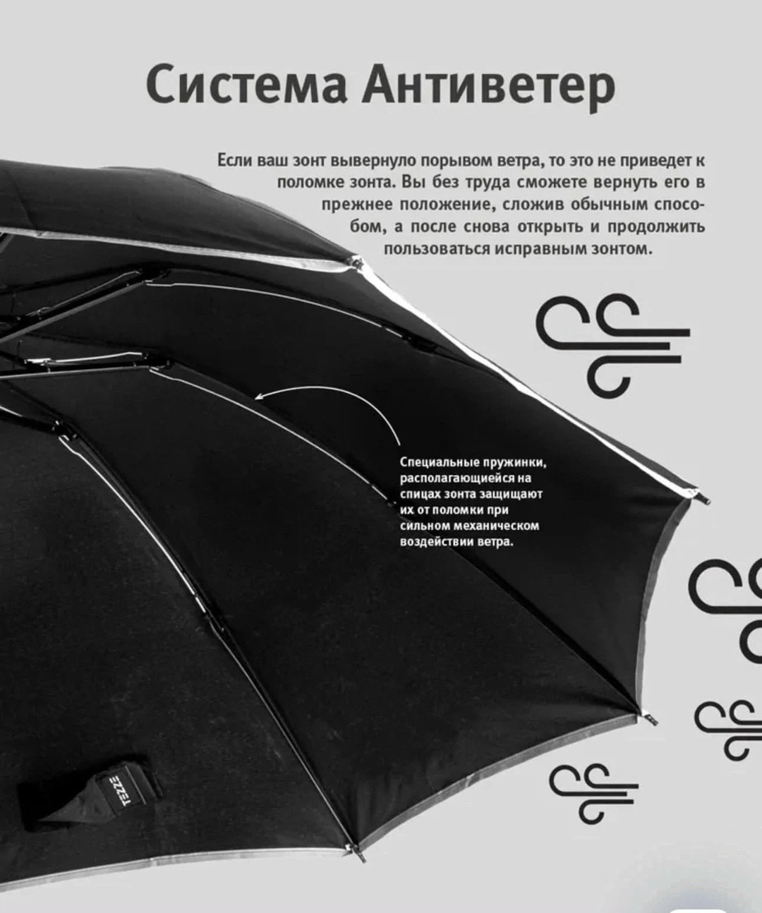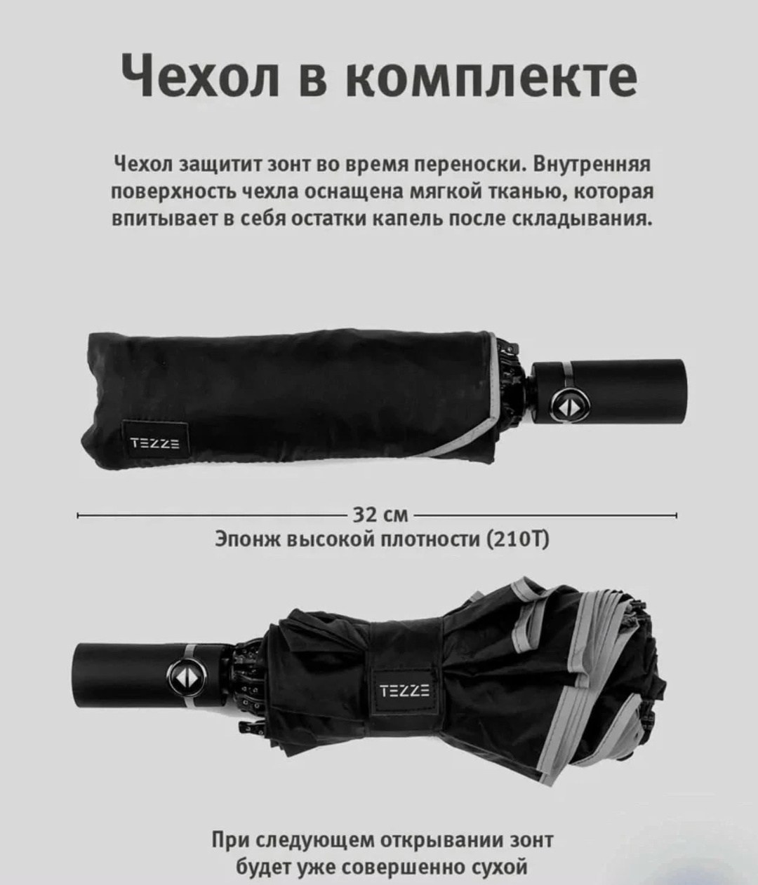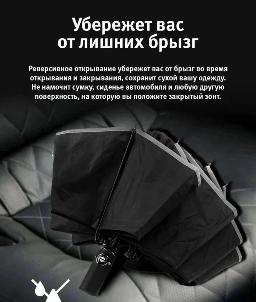Зонт усиленной конструкции Материал купола эпонж складывается в обратную сторону - зеркально стандартному механизму Такой тип складывания имеет преимуществ: капли дождя остаются внутри внешнего отделения в сложенном виде, что позволит сложить зонт и не намочить одежду Механизм: автомат, 3 сложения, открывается и закрывается кнопкой Конструкция зонта - это комплекс из девяти высокопрочных стальных 9 спиц с антикоррозийным покрытием Купол - размером 105 см с системой антиветер, имеет три сложения В комплекте идет чехол для зонта Такой зонт будет отличным подарком девушке, жене, мужчине маме или коллеге на праздник Обратный зонт имеет светоотражающую окантовку, что сделает вас заметными в темное время суток Наш автоматический зонт имеет наджную конструкцию и хорошо показывает себя в ветренную пагода.
