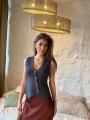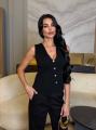 Стильная бандажная жилетка с глубоким v-вырезом подчркивает талию и красиво садится по фигуре Плотный эластичный материал формирует аккуратный силуэт, а золотые пуговицы добавляют образу элегантности и лгкой дерзости.