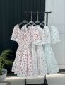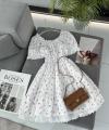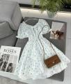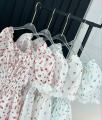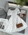 На фотографии представлено легкое платье, которое идеально подойдет как для весны, так и для лета Оно выполнено в нежном белом цвете с мелким цветочным принтом, что придает образу романтичность и свежесть Платье украшено кружевом по краям рукавов и горловины, а также имеет сборку на талии, подчеркивающую фигуру Свободный силуэт обеспечивает комфорт и легкость в движении, делая его отличным выбором для теплых дней.
