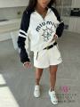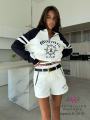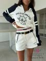 Newстильный костюм m1u m1u в морском стиле: свитшот с тематическим принтом и контрастными рукавами, дополненный белоснежными шортами Идеальный выбор для тех, кто ценит комфорт и оригинальность Подчеркните талию ремнем, который идет в комплекте и добавьте яркие аксессуары!.