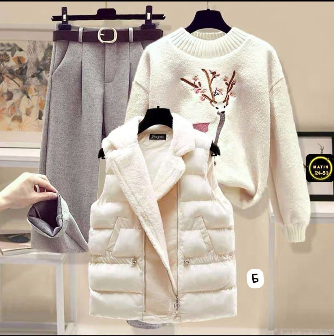 Распродажа по 12991(₽)рублейцвет без выбора женский комплект из трех предметов, осенне-зимний женский темпераментный жилет, свитер, брюки, теплый костюм из трех предметовткань синтепонфлискашемир размер: 44-46-48-50-52-54 старая цена: 2200 рублейновая цена со скидкой 1300₽.