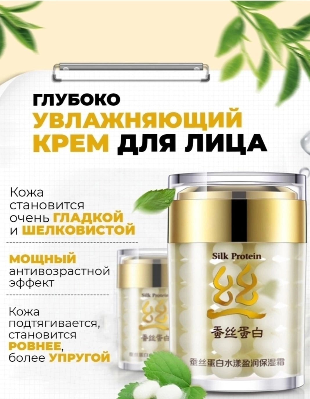 Увлажняющий крем bioaqua silk protein с протеинами шелка прекрасный универсальный помощник в борьбе с обезвоженностью кожи и возрастными изменениями Хорошо увлажняет, регулирует и нормализует работу сальных желез, выравнивает цвет и тон кожи, оказывает мощный антивозрастной эффект Протеины шелка, проникая в глубокие слои кожи, помимо увлажнения и сохранения влаги, запускают процесс выработки коллагена и эластина, благодаря чему при регулярном применении средства кожа выглядит красивой, молодой и упругой.