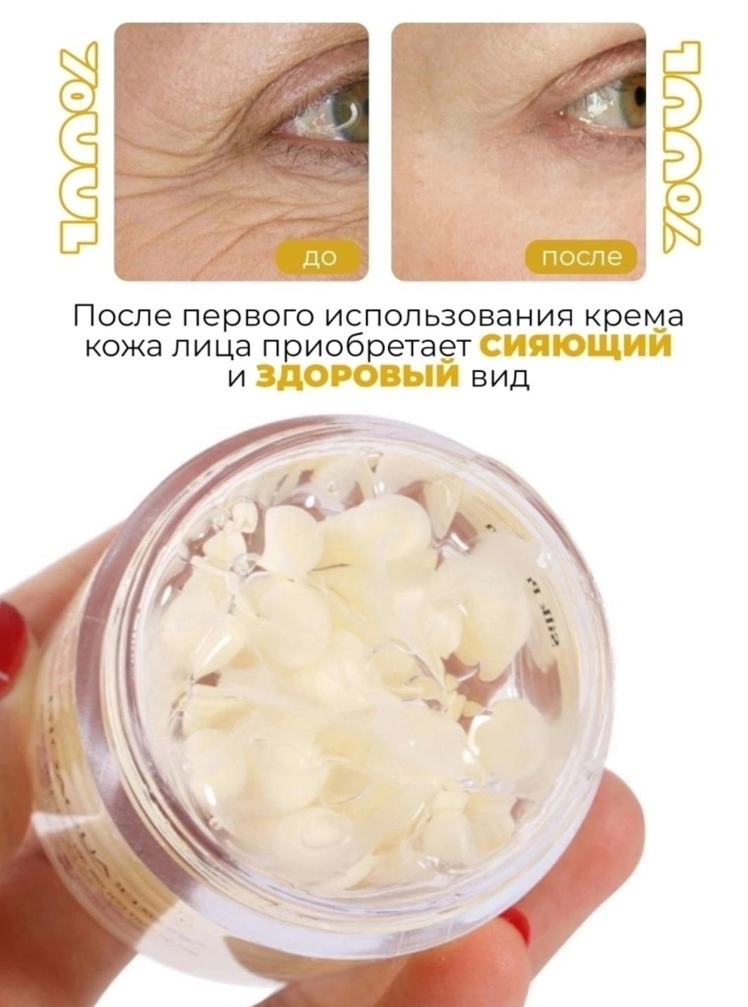 Стильная прозрачная баночка с кремом надежно упакована в золотистую коробку из плотного картона, стилизованную под сундучок с магнитом Внутри баночки белые гранулы шелка, залитые гелеобразной прозрачной массой Поставляется с лопаткой для удобства нанесения Средство имеет приятный легкий цветочный аромат Крем быстро и легко впитывается, идеально увлажняет Никаких раздражений и аллергических реакций!.