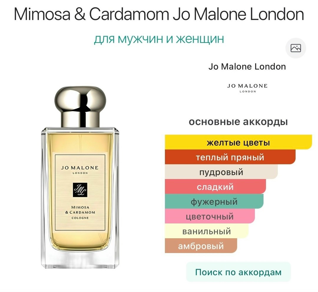 В композиции аромата теплый и солнечный букет завораживает золотисто-сладкой дымкой мимозы, грациозно окутывающей пикантные блики свежесмолотого кардамона.