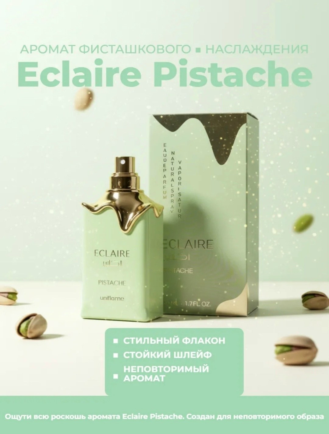 Аромат описывается как очень аппетитный, сливочный и мягкий Он сочетает в себе сладость десерта с легкой солоноватостью фисташек, создавая съедобный и стойкий эффект Часто отмечается как уютный, идеально подходящий для холодной погоды Eclaire pistache от lattafa perfumes предлагает интенсивное, бархатистое звучание, популярное среди любителей сладких парфюмов это гурманский унисекс-аромат, созданный как кремовый фисташковый десерт.